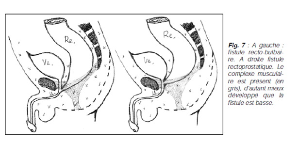 Chez le garçon, il existe le plus souvent une communication du cul de sac rectal avec la filière urinaire (fistule recto-urétrale): soit avec l’urètre au niveau de la prostate (fistule recto-prostatique) , soit avec l’urètre sous la prostate (fistule recto-bulbaire). Il existe de rares formes où le cul de sac rectal s’abouche directement dans la vessie (fistule recto-vésicale). Le pronostic de la continence est en partie dépendant de la forme anatomique : plus la fistule est haut située, plus le risque de malformation des muscles et des sphincters est élevée et donc plus le risque d’incompétence sphinctérienne augmente.